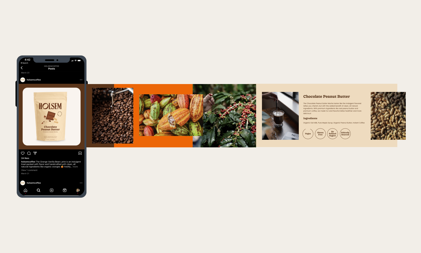 Collaborating closely with Holsem, the brand's growth was fostered through the development of a functional and beautifu e-commerce website. Additionally, a packaging system was designed to enhance the brand's visual identity and elevate the overall customer experience. Materials for their cafe located in the vibrant city of San Diego were curated to further augment Holsem's presence and impact within the local community.